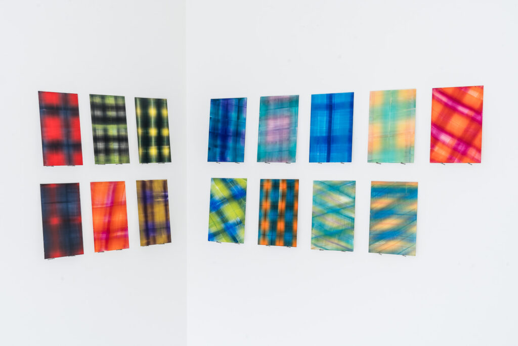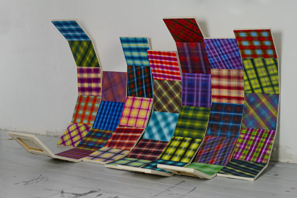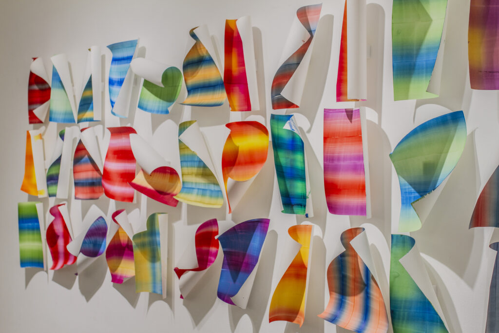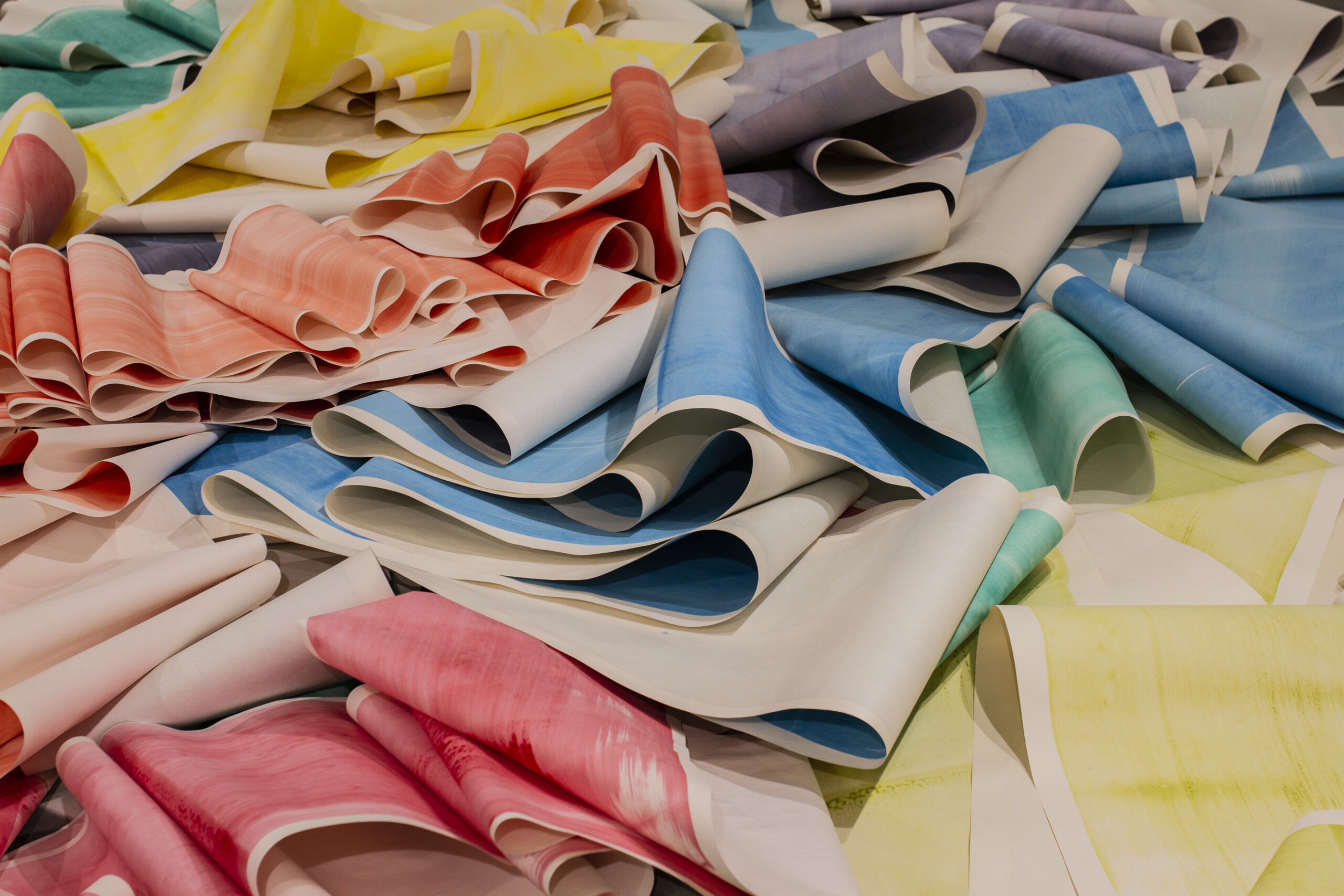 Lubię sytuacje, w których rzeczy, które wytwarzam, same mnie zaskakują i powodują, że muszę w sobie jakoś wartościować pewne jakości. Zastanowić się, co jest dla mnie w danym momencie ważniejsze, czego chcę, a czego nie chcę. Lubię ich żywotność. Papier to jedna z nowszych sytuacji w mojej twórczości – trochę pochylam się nad tą „samowolką papierową”, kiedy on się wygina, zagina, zakrywa obraz. To są nowe moje poszukiwania. Jedną z takich prac pokazywałam już w Kaliszu na wystawie „Fajnie, miło, kolorowo”. Tam była ściana wypełniona kartkami A4, pomalowanymi w bardzo prosty, pasiasty bądź kraciasty wzór, które pod wpływem wilgoci zaczynają się wyginać. W swojej masie z daleka wyglądają trochę jak alfabet, trochę jak wiatraczki, ale też się zmieniają w czasie. Bywają bardziej rozprostowane, albo gdy pojawia się większa wilgoć, zaczynają bardziej się zaginać. Długo walczyłam z tym zaginaniem się, bo jako młoda artystka czułam się zobowiązana do pokazywania prac „ładnie” – w ramie, wyeksponowanych, ewentualnie równo doklejonych do ściany. A te rzeczy działy się u mnie w pracowni i długo nie zwracałam na nie uwagi. Okazuje się, że to jest ogromny potencjał, ale też pewna symboliczność, którą można odnieść do idei takich jak nowy materializm czy witalny materializm, w którym obiekty nas otaczające mają swoją żywotność, charakter, w jakiś sposób oddziałują na nas i wpływają na to, co się w otoczeniu dzieje, jak je odbieramy. Myślę, że tu jest bardzo symboliczne, ale jednak wyraźne mrugnięcie okiem w tę stronę z mojej strony i bardzo chciałabym dalej na to zwracać uwagę. Tak samo te długie zwoje – mogę je rozwinąć i spróbować ułożyć, ale one pod wpływem swojego ciężaru, podmuchu wiatru, tego, że ktoś przejdzie obok, zmieniają się w trakcie. To jest super fajne i super odświeżające podczas pracy, że nie jestem w skostniałej relacji z tymi pracami. One przez cały czas coś do mnie mówią, a ja muszę się nauczyć ich słuchać.