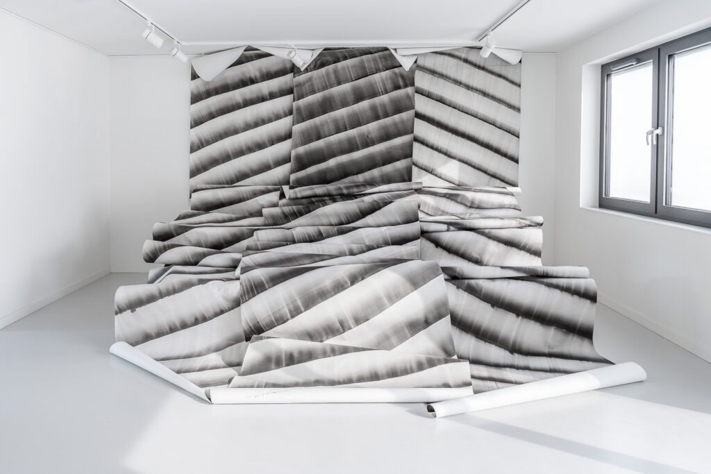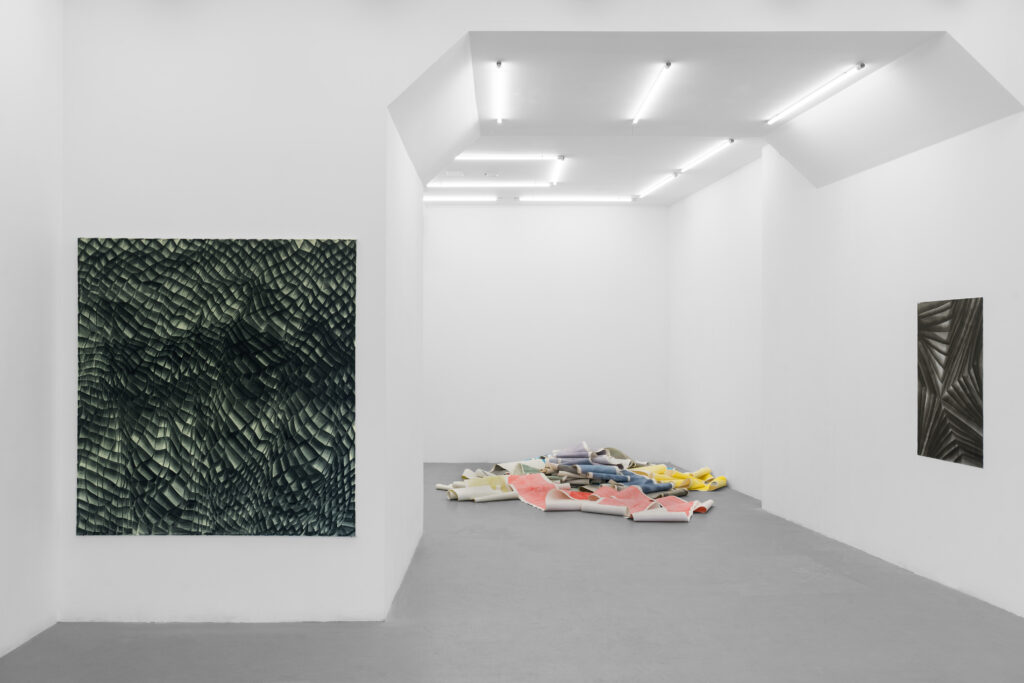 KK: Dla mnie to też jest bardzo interesujące, bo ta praca – zwój – z takim „pęknięciem” wśród jednak dużych obrazów nabitych na krosno, powieszonych na ścianie, intensywnych, ta praca istnieje po drugiej stronie spektrum. Zwoje są na cienkim papierze, na którym widać zagięcia, każdy ślad drogi, którą przeszły. Przez to, że są bardzo długie, za każdym razem układasz je na nowo, w różnych konfiguracjach – na ziemi, na postumentach.
