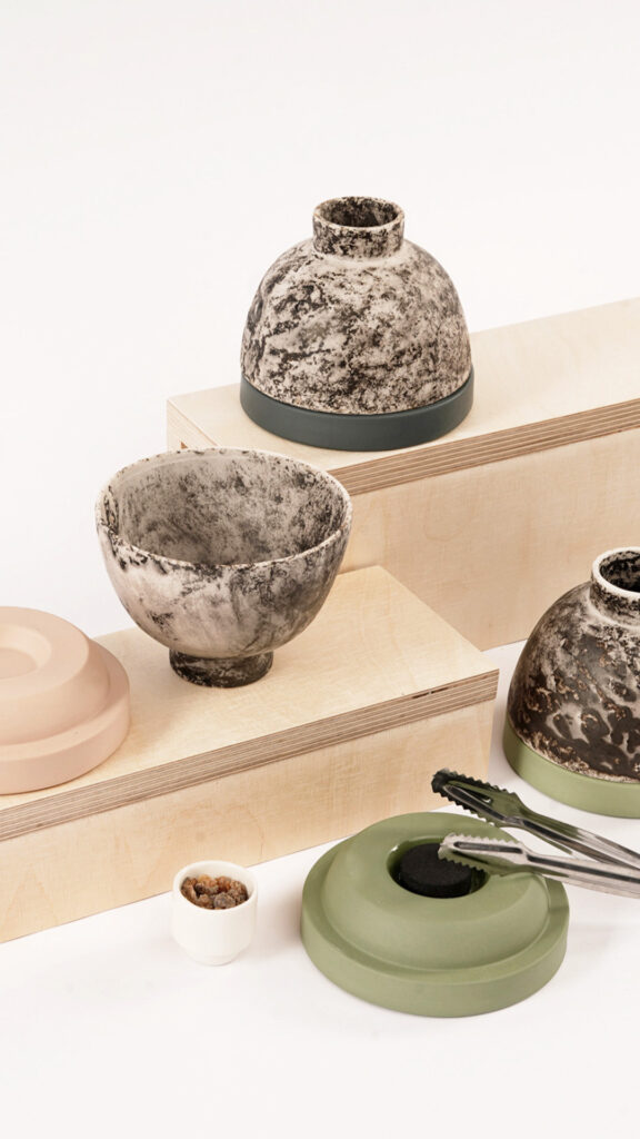 M.J.: Tak, tutaj na pewno chciałabym wspomnieć o mojej pracy, która nazywa się „Sen o regionie”. Jest to praca dla mnie bardzo ważna, bo jest to kolekcja, która wiąże się z moim doktoratem. Jesto to współczesna zestawa stołowa, która została zaprojektowana dla produktów, które posiadają znak dziedzictwa kulinarnego, które są związane z regionem Wielkopolski. W tej kolekcji pojawiają się takie obiekty, jak na przykład mały dzbanek, olejarka na olej rydzowy, solniczka, czy pojemnik do przechowywania soli na sól kłodawską. Są w niej czarki, talerze, kadzielnica. Ten cały zestaw jest multifunkcyjny. Różne elementy tego zestawu można ze sobą łączyć, tworząc kolejne nowe funkcje, jakby poszerzając funkcje tego zestawu. Dla mnie ważne było, żeby też przemycić w tej kolekcji nieoczywiste inspiracje związane z regionem i między innymi znalazła się tam taka technika, o której już wspomniałam, która jest dla mnie niezwykle fascynująca, technika wypału w zakwasie chlebowym, inaczej Raugo. Też można ją spotkać pod taką nazwą, jak obvara. Jest to technika wypału naczyń w zakwasie chlebowym stosowana przez ludy bałtyckie, głównie. Prawdopodobnie ta technika pojawiła się w średniowieczu, nie jest to dokładnie określone, ale niektórzy spekulują, że kiedyś komuś rozgrzany kawałek ceramiczny wpadł do żuru i okazało się, że ta ceramika stała się bardziej wytrzymała. To umieszczenie gorącego naczynia w zakwasie chlebowym zapewnia zamknięcie porów tego naczynia, co sprawia, że ono mniej chłonie wody, mniej chłonie zanieczyszczeń, tym samym jest bardziej wytrzymałe i higieniczne. Oczywiście ono nie jest higieniczne na nasze dzisiejsze standardy, ale na pewno jest o wiele bardziej wytrzymałe, a to co mnie interesuje najbardziej, to ten wypał powoduje, że na czerepie tego naczynia pojawiają się bardzo intrygujące dymne wzory i ta właśnie estetyka jest czymś niezwykle pociągającym dla mnie. W części mojej kolekcji „Sen o regionie” znalazły się obiekty właśnie wypalone według tej tej techniki i są to takie kopułki, które również są wielofunkcyjne. Można taką kopułkę nałożyć na wazon z tej kolekcji i tym samym zmniejszyć średnicę tego wazonu. Można położyć tą kopułkę na jeden z talerzy i tym samym zbudować sobie kadzielnicę, na której można palić żywice na węgielku trybularzowym lub po prostu takie też stożkowe kadzidła. I to, co dla mnie jest również ciekawe, to jest to, o czym powiedziałaś, to jest ta rola przypadku w wykorzystaniu tej techniki. Tak jak gdzieś w moim klimacie i w mojej estetyce są rzeczy bardzo powściągliwe, minimalistyczne, pozbawione dekoracji, jakieś takie monochromatyczne, tak wydawało mi się świetnym pomysłem, żeby zestawić ze sobą te dwa światy, tej bardzo takiej połyskliwej, jednokolorowej, idealnie dopracowanej porcelanowej zastawy z tą dzikością wypału Raugo. Można sobie wyobrazić, że te elementy wypalone w zakwasie są w odcieniach czarno-brązowych, wyglądają tak trochę jakby je liznął ogień. To, co jest ciekawe, to też to, że te wzory, które pojawiają się na naczyniach wypalanych czy zanurzanych w zakwasie tak naprawdę, są za każdym razem unikatowe. Nie wiadomo, w jaki sposób ten zakwas przylepi się do naczynia. Z moich obserwacji i badań wynika, że duże znaczenie ma temperatura, przy której wyjmuję z pieca gazowego obiekt ceramiczny. W skrócie – ten proces wygląda tak, że to jest proces plenerowy, wypał plenerowy. Mam własnoręcznie zbudowaną beczkę, do której podłączam palnik gazowy. Ta beczka nagrzewa się razem z ceramiką do około 900 stopni i później w danym momencie wyjmuje się te naczynia, zanurza w zakwasie, który zaczyna bąblować, zaczyna pojawiać się też taki charakterystyczny trochę przypalony zapach skórki od chleba, co jest fajnym, takim też sensorycznym wymiarem i takim nawet spektaklem, powiedziałabym. Później po zanurzeniu tego naczynia w zakwasie, który bąbluje, który odciska te swoje wzory, zanurza się naczynie w zimnej wodzie po to, żeby przyspieszyć proces jego stygnięcia. Wtedy też pojawia się bardzo dużo dymu, jakieś takie chlupanie, bulgotanie i ten proces uważa się za zamknięty wtedy. Jest to właśnie ta odnoga też mojej działalności ceramicznej, w której z ciekawością przyjmuję to, co się zdarzy nie planując i mam też nadzieję, że w tym roku uda mi się zaprojektować i wykonać więcej obiektów związanych z tą techniką.